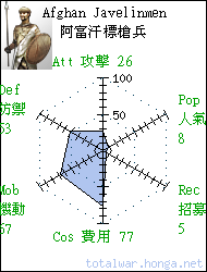 Afghan Javelinmen 阿富汗標槍兵 missile infantry Made up from fierce Afghan tribesmen, these excellent skirmishers hurl javelins at their foes, but can fight at close quarters if necessary. 阿富汗標槍兵驍勇善戰,投擲 標槍極為精準,能有效殺傷敵 軍,破壞對方陣型,但近戰肉 搏卻非常脆弱。