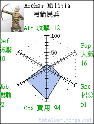 弓箭民兵是裝備戰弓的農夫,應徵入伍為城邑提供遠程防禦力量。他們盔甲簡陋,只適合在城牆內對敵軍進行遠程殺傷。