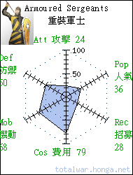 Number of turns to build, Cost of unit to construct, Cost of upkeep, Cost of upgrading weapons, Cost of upgrading armour, Cost for custom battles, Limit in custom battle, Cost for punish 徵召回合, 招募費, 維持費, 升級武器, 升級盔甲, 自訂戰役, 多於幾隊, 懲罰金額