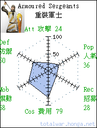 Number of turns to build, Cost of unit to construct, Cost of upkeep, Cost of upgrading weapons, Cost of upgrading armour, Cost for custom battles, Limit in custom battle, Cost for punish 徵召回合, 招募費, 維持費, 升級武器, 升級盔甲, 自訂戰役, 多於幾隊, 懲罰金額