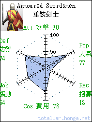 Armoured Swordsmen 重裝劍士 heavy infantry Footmen of the knightly class able to afford excellent armour and swords, they can punish most other infantry. 重裝劍士出身貴族,因此盔甲 武器極為精良,能令大多數對 手潰不成軍。