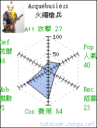 Arquebusiers 火繩槍兵 missile infantry Fired at close range, this noisy, smokey and lethal weapon causes morale damage as well as physical hurt. 火繩槍兵通常近距離齊射,發 射時的硝煙和巨響令這種恐怖 武器極為震撼人心,無論精神 還是肉體上都給敵軍致命打擊。