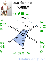 Arquebusiers 火繩槍兵 missile infantry Fired at close range, this noisy, smokey and lethal weapon causes morale damage as well as physical hurt. 火繩槍兵通常近距離齊射,發 射時的硝煙和巨響令這種恐怖 武器極為震撼人心,無論精神 還是肉體上都給敵軍致命打擊。