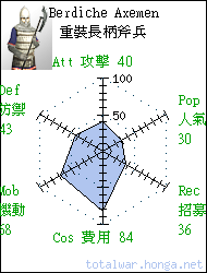Berdiche Axemen 重裝長柄斧兵 heavy infantry Two-handed axemen used as shock troops. Can be armoured from mail to brigandine. 重裝長柄斧兵身穿鏈甲或鎖甲, 其狂野衝鋒極為恐怖。