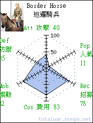 Border Horse 巡邏騎兵 light cavalry Equipped with light mail and spear, this unit is handy for out flanking your opponent and chasing down archers. 巡邏騎兵裝備輕型鏈甲和長矛, 適合用於側翼包抄和追擊殘兵。