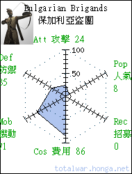 保加利亞盜匪們經常攔路洗劫商旅,有時甚至謀財害命。當盜團成長為一定規模,他們就踏上傭兵生涯,為僱主效命。儘管盜匪們弓箭技藝十分出色,但掠擄戰利品卻需要近身接觸,因此他們亦隨時準備與敵軍肉搏廝殺。盜團成員裝備復合弓、長劍、鑲甲和盾牌。