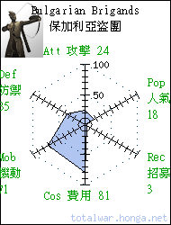 保加利亞盜匪們經常攔路洗劫商旅,有時甚至謀財害命。當盜團成長為一定規模,他們就踏上傭兵生涯,為僱主效命。儘管盜匪們弓箭技藝十分出色,但掠擄戰利品卻需要近身接觸,因此他們亦隨時準備與敵軍肉搏廝殺。盜團成員裝備復合弓、長劍、鑲甲和盾牌。