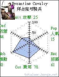 Byzantine Cavalry 拜占庭弓騎兵 missile cavalry Versatile lightly armoured medium cavalry, equally able shooting their bows, or fighting with their swords. 拜占庭弓騎兵戰術靈活,屬於 略微輕裝的中型騎兵部隊,無 論遠程射擊還是近身格鬥,戰 力都頗為出色。