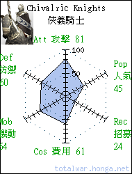 這些盔明甲亮的騎士,是高貴情操和騎士榮譽的典範。同時,他們亦為精悍勇士,在無數競技比賽和比武決鬥中鍛煉得驍勇善戰。一旦踏入戰場,騎士們全鋼板甲刀槍不入,只有最精銳的長矛方陣方可擋住他們的全力衝鋒。