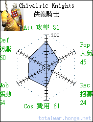 Chivalric Knights 俠義騎士 heavy cavalry Elite warriors clad in steel plate armour, these men pack a ferocious charge, while being hard to kill. 俠義騎士裝備全鋼板甲,刀槍 不入,衝鋒威力極為恐怖。