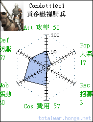 Number of turns to build, Cost of unit to construct, Cost of upkeep, Cost of upgrading weapons, Cost of upgrading armour, Cost for custom battles, Limit in custom battle, Cost for punish 徵召回合, 招募費, 維持費, 升級武器, 升級盔甲, 自訂戰役, 多於幾隊, 懲罰金額