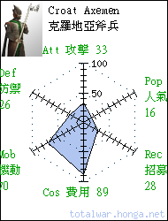 Croat Axemen 克羅地亞斧兵 light infantry Hardy warriors armed with deadly two-handed axes and protected by light armour. Accustomed to fighting in their rugged native terrain. 克羅地亞斧兵身穿輕甲,雙手 揮動致命巨斧,灑出漫天血雨, 若在家鄉崎嶇地形作戰則更為 恐怖。
