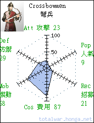 Crossbowmen 弩兵 missile infantry Slow to reload, but a potent and easy to use missile weapon firing powerful bolts. 弩兵只須短期訓練便可上陣作 戰。弩弓裝填緩慢,射程亦遠 遜弓箭,但威力頗為強勁。