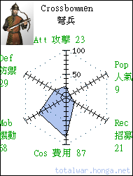 Crossbowmen 弩兵 missile infantry Slow to reload, but a potent and easy to use missile weapon firing powerful bolts. 弩兵只須短期訓練便可上陣作 戰。弩弓裝填緩慢,射程亦遠 遜弓箭,但威力頗為強勁。