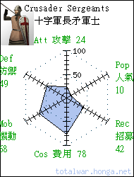 任何人軍旅生涯中都不免有小小污點,因此這些貴族為了洗清罪孽,毅然加入十字軍,在天主名義下揮動長矛,與異教徒軍隊殊死搏殺。軍士們身穿鏈甲,使用長矛進行防禦作戰頗為出色,堪稱精銳。
