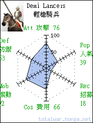 Demi Lancers 輕槍騎兵 heavy cavalry Armed with a lance but with less armour these units are mobile and deadly. 輕槍騎兵身穿輕甲,手持騎槍, 極為靈活致命。