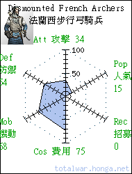 Dismounted French Archers 法蘭西步行弓騎兵 missile infantry Protected by brigandine armour, these archers have a horse to ride to battle on, but still fight on foot. 法蘭西步行弓騎兵身穿鑲甲, 通常騎馬行軍進入戰場,而後 下馬步行作戰。
