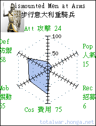 Dismounted Men at Arms 步行意大利重騎兵 heavy infantry Dismounted, these men are effective and well protected infantry. 步行意大利重騎兵是身穿重甲, 頗為出色的步兵部隊。