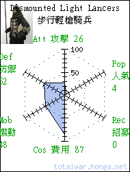Dismounted Light Lancers 步行輕槍騎兵 spearmen infantry Despite preferring to fight on horseback, these lightly armoured warriors have dismounted to fight on foot. 輕槍騎兵儘管鍾愛騎馬廝殺, 但有時亦會步行作戰。