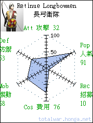 Retinue Longbowmen 長弓衛隊 missile infantry Well armoured professional soldiers. Confident and deadly. 長弓衛隊是盔甲精良的職業部 隊,戰技出色,殺傷驚人。