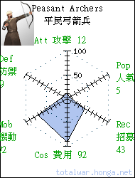 平民們通常使用弓箭進行狩獵,裝備獵弓和短刀。中世紀社會底層的民眾生活極為艱辛,因此這些入伍平民部分是由於強制應徵,部分卻出於自願,希望能夠獲得更好生活水平。平民弓箭兵表現平平,不能寄予過高期望。