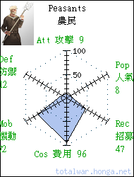 Peasants 農民 light infantry In times of war peasants are forced from their farms and drafted into levies. Good cannon fodder. 農民經常在戰時被強行徵召入 伍,充任廉價炮灰。