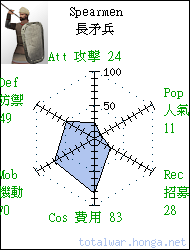 Spearmen 長矛兵 spearmen infantry Regular troops comprised of freemen, equipped with some armour and a spear, able to form a defensive ring of spears. 長矛兵出身自由民,裝備長矛 和盔甲,能夠以圓陣拒敵。