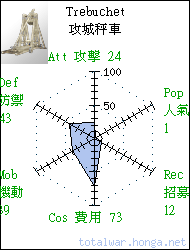 The counter-weight Trebuchet is an evolution of the man-powered mangonel and catapults dating back before the 11th century. It has quickly spread throughout the world as an effective siege engine capable of lobbing large wall- crushing boulders. The Trebuchet is also able to fling such things as burning missiles and rotten animal remains to devastate enemy units.
