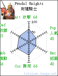 Feudal Knights 封建騎士 heavy cavalry Protected by heavy armour and armed with a lance, these elite warriors crush and ride down their opponents. 在重裝盔甲的防護下,封建騎 士們手持沉重騎槍,將敵軍踏 為齏粉。