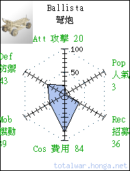 Ballista 弩炮 missile siege Resembling a giant crossbow, this powerful weapon can fling a javelin to a great range, skewering men with ease. 弩炮即巨型弩弓,可發射類似 標槍的粗壯弩箭,射程極遠, 能穿透敵陣。