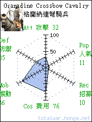 Granadine Crossbow Cavalry 格蘭納達弩騎兵 missile cavalry These troops combine the crossbow, favoured by Granadine troops, with the Eastern tradition of mobile warfare. 格蘭納達弩騎兵將東方傳統的 機動戰術與弩弓威力相結合, 以高速機動彌補弩弓裝填緩慢 的缺憾,因此作戰頗為出色。