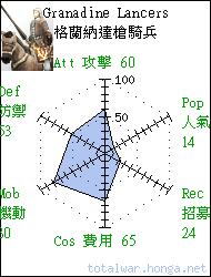 Granadine Lancers 格蘭納達槍騎兵 heavy cavalry Recruited in Moorish Iberia, these troops are trained and well equipped heavy cavalry, capable of deadly charges. 格蘭納達槍騎兵來自伊比利亞 地區的摩爾族裔,是訓練有素 盔甲精良的重騎兵,衝鋒威力 驚人。