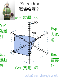 Hashashim 戰場哈薩辛 heavy infantry The Hashashim are a semi-religious sect of stealthy assassins. On the battlefield they fight with sword and shield. 哈薩辛為半宗教性質刺客團體, 精擅潛伏和暗殺,在戰場上以 長劍和盾牌作戰。