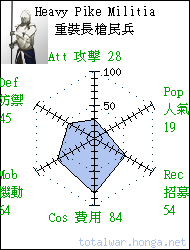 Heavy Pike Militia 重裝長槍民兵 spearmen infantry Levied troops equipped with pikes and protected by heavy armour. Good defence against cavalry. 重裝長槍民兵裝備長槍和重裝 盔甲,擅長對抗騎兵。