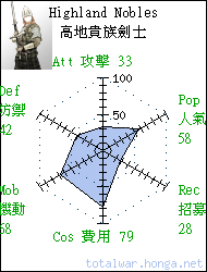 Highland Nobles 高地貴族劍士 heavy infantry Scottish shock troops wielding a large two-handed sword and armoured in chain. 高地貴族劍士為蘇格蘭軍中精 銳,身穿鏈甲,揮舞雙手巨劍。