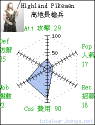 Highland Pikemen 高地長槍兵 spearmen infantry Well trained, but sometimes reckless clansmen armed with pikes, able to form a wall of pikes against cavalry. 高地槍兵儘管來自蠻勇部民, 但通常訓練有素,可組成槍陣 對抗騎兵。