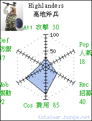 高地斧兵是來自蘇格蘭高地剽悍驍勇的戰士。他們體格健壯,作戰驍勇,為獲得戰利品和奴隸,儘管自身盔甲簡陋,依然揮動戰斧盾牌,奮勇搏殺劫掠。高地斧兵軍紀極差,惡名遠播,儘管悍不畏死,但遠非職業重裝部隊敵手。
