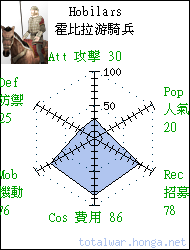 Hobilars 霍比拉游騎兵 light cavalry Light cavalry with spears. Useful for chasing down light infantry, and pursuing fleeing enemy 游騎兵手持長矛,用於對抗輕 裝部隊和追擊殘兵。