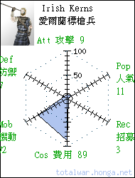 Irish Kerns 愛爾蘭標槍兵 missile infantry Skirmishing unarmoured Irish warriors armed with javelins and handweapon, willing to fight for whomever can pay them. 愛爾蘭標槍兵是輕裝突襲部隊, 裝備標槍和短柄格鬥兵刃,隨 時願意接受高價僱傭。