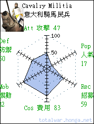 Cavalry Militia 意大利騎馬民兵 heavy cavalry Encased in mail and equipped with lances and swords these troops are effective fighters. 騎馬民兵裝備鏈甲、騎槍和長 劍,是出色的騎兵部隊。