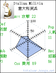 Italian Militia 意大利民兵 light infantry Local militias play an important role in Italian armies. These troops are armed with short spear and shield. 民兵部隊在意大利軍中地位頗 重,裝備短矛和盾牌。