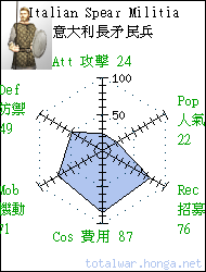 來自諸城市及周邊城鎮的民兵部隊,在意大利軍中地位頗重。他們響應強制性短期服役,以強烈的城市自豪感構成戰鬥信念。這些部隊久經戰陣,裝備長矛和部分盔甲,防禦作戰極為堅韌,表現出色。