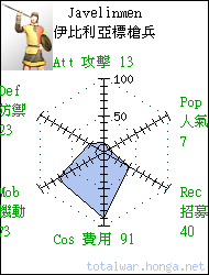 Javelinmen 伊比利亞標槍兵 missile infantry These troops are drawn from the Spanish peasantry, protected by light armour and fighting with the javelin, in Iberian fashion. 這些標槍兵來自西班牙農民, 裝備輕甲標槍,以傳統伊比利 亞風格作戰。