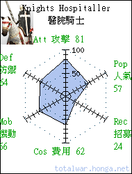 Knights Hospitaller 醫院騎士 heavy cavalry Well trained and disciplined these knights are amongst the deadliest heavy cavalry in all Christendom. 醫院騎士訓練有素,紀律嚴明, 躋身基督世界中最為精銳的騎 兵部隊。