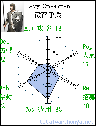 Number of turns to build, Cost of unit to construct, Cost of upkeep, Cost of upgrading weapons, Cost of upgrading armour, Cost for custom battles, Limit in custom battle, Cost for punish 徵召回合, 招募費, 維持費, 升級武器, 升級盔甲, 自訂戰役, 多於幾隊, 懲罰金額