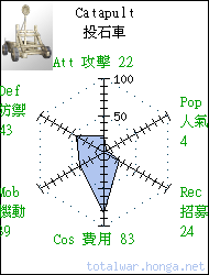 Catapult 投石車 missile siege Older style rock-flinging wooden artillery piece. Can throw flaming and normal shots. 投石車為投擲巨石的木質器械, 可投擲巨石和火球。
