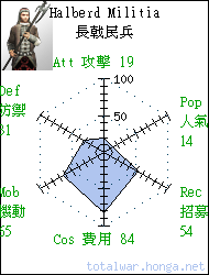 Halberd Militia 長戟民兵 heavy infantry These townsfolk carry long halberds that can fend off cavalry and crush the most heavily armoured of foes. 長戟民兵使用長戟作戰,擅長 對抗騎兵和其它重裝部隊。