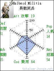 Halberd Militia 長戟民兵 heavy infantry These townsfolk carry long halberds that can fend off cavalry and crush the most heavily armoured of foes. 長戟民兵使用長戟作戰,擅長 對抗騎兵和其它重裝部隊。