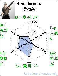 Hand Gunners 手炮兵 missile infantry Somewhat inaccurate but capable of firing a powerful shot, the noise and smoke from these handguns can demoralise enemy troops. 手炮兵遠距射擊不甚精準,但 近距威力極大,其發射時的彌 漫硝煙和恐怖巨響令敵軍魂飛 魄散。