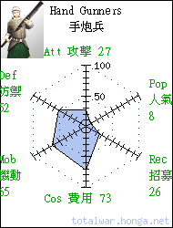 Hand Gunners 手炮兵 missile infantry Somewhat inaccurate but capable of firing a powerful shot, the noise and smoke from these handguns can demoralise enemy troops. 手炮兵遠距射擊不甚精準,但 近距威力極大,其發射時的彌 漫硝煙和恐怖巨響令敵軍魂飛 魄散。